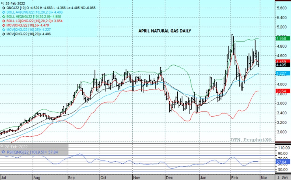 The market started the week with a 30 cent price swing as the April contract ended 7 cents lower at 4.402 after trading as high as 4.683 on the Sunday night open. The situation in Ukraine offered the early strength as commodities across the board saw a wholesale reversal of Friday’s weakness. Attention turned to domestic fundamentals as the day session got under way, with the weather again driving prices down on forecasts showing significantly lower HDD expectations compared to Friday afternoon runs. Production levels also offered resistance, as they continued to recover from setbacks last week due to freeze-offs in the South Central region. Output was just shy of 94 bcf/d over the weekend after dipping as low as 92.5 bcf last week. LNG flows were supportive as they appeared to be recovering from recent weakness, exceeding 13 bcf/d on Saturday. Geopolitical tensions should continue to underpin the market, as the 4.40 support level was tested today and is likely maintained as long as we don’t suffer substantial setbacks in demand. The range up to 4.70 has been traveled 5 times in the last week, with any move higher finding little resistance until that area.