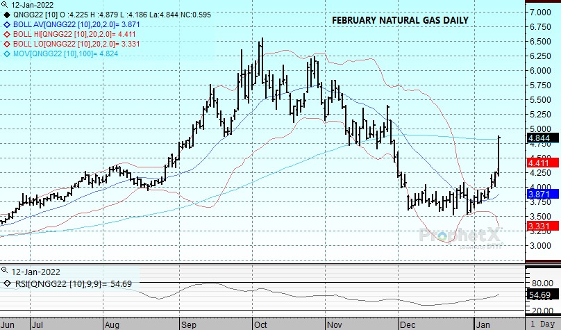 The rally continued today as the February contract gained over 60 cents to end the day at 4.857 and near the session highs, while the March gained 36 cents to 4.327. The strength continues to be coming from the arrival of cold temperatures, as January is shaping up to be one of the coldest in nearly a decade. The 15-day forecasts are also pointing to the potential for extremely cold temperatures to end the month, with longer term outlooks hinting at a carryover into February. Production has yet to show any bounce from its recent retrenchment, and with LNG flows reaching up to 13 bcf today the market did not lack for supportive influences. Despite the positive fundamental picture, the move was exaggerated as short positions were put in a squeeze and began to head for the doors. Tomorrow’s storage report is expected to show a draw of 173 bcf compared to the 5-year average decrease of 155, while early estimates for next week are nearing 200. With the strong close the market has reached the 100-day moving average near 4.82, and follow-through likely targets the 5.00 area. Initial support should emerge in the 4.65-4.70 range.