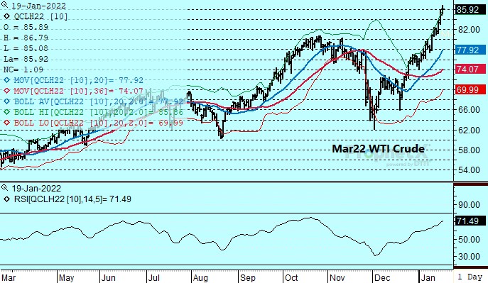 Heightened geopolitical tension and supply disruptions continue to move petroleum values higher, with WTI and Brent reaching levels not seen since October 2014. Reports that an accidental fire on the Kirkuk-Ceyhan pipeline, which carries crude from Northern Iraq to Turkey for export, attracted additional short covering. The buying interest eased following reports of a resumption of oil flows today but nervousness following attacks yesterday by Houthi rebels against an oil installation in Abu Dhabi, along with continued tension along the Ukrainian border with Russia kept nervousness high over unexpected supply shortfalls. In the background remains the inability of OPEC to hit production targets due to supply chain issues and lack of investment, along with the lack of progress in the Iran nuclear negotiations.