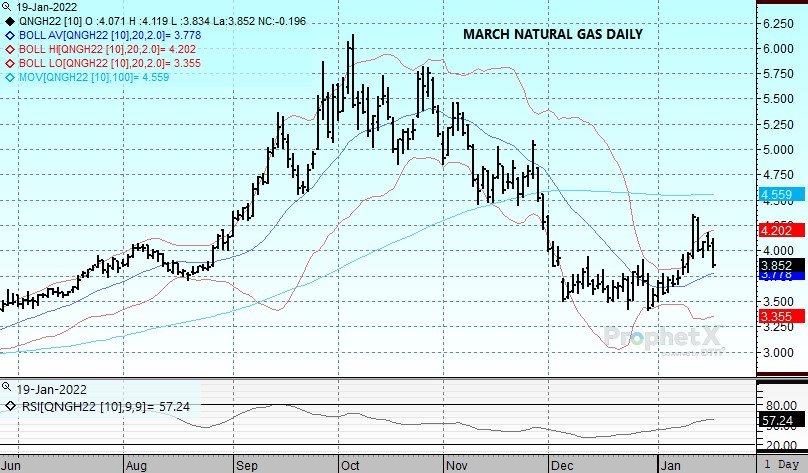After finding an upside bias coming out of the weekend, the market retrenched today with the February contract down 25 cents to 4.031 while the active March lost over 20 cents to settle at 3.845. With LNG feedgas above 13 bcf/d over the weekend and production dropping below 94 bcf/d early in the week, the market appeared to be well supported as below normal forecast were maintained after the holiday. Trade appears to be looking beyond the cold regime that is currently in place, along with the 6-10 day that could bring the coldest temperatures of the season. Focus has turned to early February, which is still indicated below normal but trending warmer in recent revisions. Tomorrow’s storage report is estimated to show a 194 bcf withdrawal compared to the 5-year average decrease of 167. A draw above expectations is likely needed to stave off the downside momentum, as the poor close points to a near term test of the 3.77 area which would mark a 68 percent retracement of the new year rally. Failing there would open the potential for a retest of the December lows. Any support from a large draw or colder forecast revisions will find resistance in the 4.00 area.