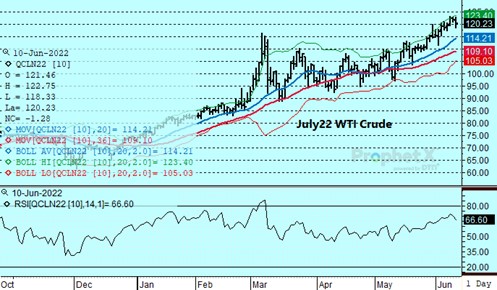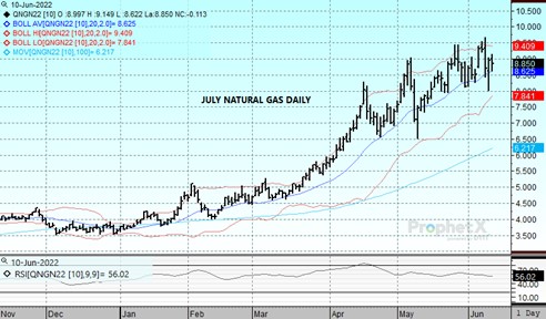 The market has traded erratically since the explosion at Freeport LNG on Wednesday. Prices tested down to the 8-dollar level yesterday as speculation over the extent of damage and possible duration of the shutdown flushed out nervous selling. Prices reversed following the weekly storage report that showed a 97 bcf injection. The build was in line with estimates but brough out buying interest as some had expected a triple digit increase. A reiteration from Freeport estimating the down time at three weeks added upside momentum as the 40-45 bcf of additional supply was considered to be offset by power demand from extreme heat expected in Texas through early next week. Decreased wind and a continuation of unimpressive production levels near 95 bcf/d also lent support as the market traded back up to as high as 9.149 today before ending lower by 11.3 cents at 8.85. With the 3 week estimates from Freeport maintained, the risk is for a longer than expected shutdown. Therefore the 9-dollar level likely remains solid resistance until the picture becomes clearer. Any increase in duration could lead to a quick retest of the 8-dollar area.