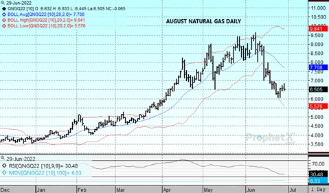 Prices rallied early in the session on decreased production levels but ran out of steam as the day progressed to end with a loss of 7.2 cents at 6.498 basis August. After weekend production had hinted at improvement, nearing 96 bcf/d, numbers have pulled back into midweek with today’s lower 48 output estimated at 94 bcf. The rally tested the 6.85 area but failed there as that level remains initial resistance, aided by another minor downward revision to CDD expectations that kept the bulls in check. Expectations for tomorrow’s storage injection have settled into the 74 bcf area verses the 5-year average of 73. A repeat of last week’s miss and a higher build could refocus concern on the extra gas available due to Freeport’s shutdown and flush prices to a test of 6 dollars.