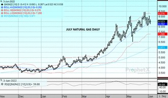 Prices traded on both sides of unchanged before eeking out a small gain on the day, settling 3.8 cents higher at 8.523 basis July. The support came from near record temperatures expected in Texas this weekend and into early next week, as power demand looks to push against all time highs. Although the overall US forecast is not out of line, the early heat in the South has intensified fears of a hot summer. The market had been uder fairly heavy selling pressure coming into the session after yesterday’s storage report showed a 90 bcf injection into stocks that was above estimates in the 80-85 area. Despite the miss, the deficit to the 5 year average increased to 337 bcf. Production continues to be unimpressive, dropping back under 95 bcf/d after the holiday weekend. The weather concerns along with stagnant production and solid LNG flows continue to keep a bid under this market. The 8 dollar level, which marks a 50 percent retracement of the rally since early May, remains solid support. The 8.68 area on the upside is the only level in the way of another test of 9 dollars.