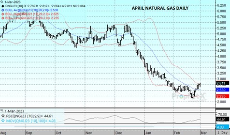 The market continued to have an upside bias, with the April contract tacking on 6.4 cents today to settle at 2.811. The recovery is being supported by two main factors, the steady return of Freeport export capacity and the maintenance of below normal temperature expectations into the middle of March. After two months of poor demand, the potential swing to some semblance of normalization has helped to flush out profit taking and ease trade concerns over taking a long stance. In the background were cooler temperatures in Europe, where a similar mild winter had helped storage levels there reach ample levels as well. The push through 2.80 now puts the next upside target at 3 dollars. Any extension beyond there would need the cooler forecasts to materialize, and would target the 3.36 level, which marks a 38 percent retracement of the break since mid-December. A retrenchment should find initial support in the 2.53-2.50 area.