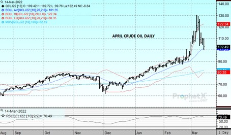 Prices traded sharply lower coming out of the weekend as crude ended the day with losses of over 6 dollars at 103.01 while the product markets were lower by more than 14 cents. Selling was ignited by reports that both Russian and Ukrainian negotiators had hinted at progress in talks toward a cease fire. Despite the unlikelihood of any major breakthroughs as intense fighting continued in the region, trade nonetheless responded with concerted selling as volume and open interest continue to pull back in the face of extreme volatility and increased margins. Reports that China was seeing a jump in the number of COVID infections added background weakness as concerns resurfaced over demand destruction in the event of another flare up of the pandemic.
