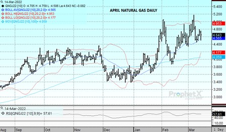 With temperatures rising in the near term, the market was unable to continue the rally seen late last week as the April contract ended the day nearly 7 cents lower at 4.658. Weakness to overseas prices also offered resistance as Russian flows into Europe remained at normal levels over the weekend and some hints at progress toward a cease fire were indicated. The weakness came in spite of slowing output over the weekend that was the product of cold temperatures that lead to freeze-offs in some production areas. LNG flows also registered a new record high on Saturday just over 13.4 bcf/d but were unable to generate substantial buying interest. The 4.60 level was taken out overnight, and today’s lows near 4.50 now look like solid support. The 4.82 level should offer upside risistance as it marks a 50 percent retracement of last weeks break.