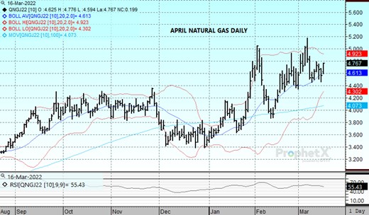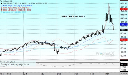 The petroleum complex saw some stabilization today with an inside day on the charts after hefty losses to start the week. The April crude oil pushed well below the 100-dollar level yesterday before slipping another 1.40 today to settle at 95.04. Pressure continued to be provided by positive statements regarding the Russia/Ukraine negotiations and fear of a return of lockdowns in China due to the spread of the Omicron variant. Global concerns regarding demand destruction due to high prices seemed to add to the negative tone as the theory that “high prices are the best cure for high prices” began to prove true. The weekly storage report was generally bearish and offered further selling pressure as the day progressed.