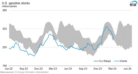 It does not appear dire, despite the drone attacks on Russian refining, as US stock levels are higher than they were in June of 2022. With refineries coming out of maintenance and new capacity coming on stream, supply is likely to meet demand but might be slow to develop at a time when Russian gasoline production could fall between 7-10 percent and crude exports pick up. Subsequently, the gasoline, or RBOB crack, could probe higher into the 38-40 area basis June before better resistance develops.