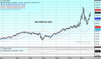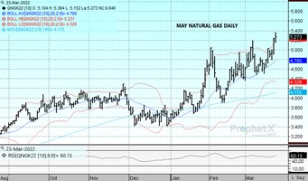 Global concerns over energy supply due to the war in Ukraine continued to drive the market higher, as the crude oil peaked at 115.40 today before settling 5 1/2 dollars higher at 114.93.  The heating oil lead the complex, gaining 22 cents as a larger than expected drop in distillate stocks in the DOE report and heightened worries overseas as Russia is reportedly slowing its output of diesel, which Europe depends on for a large percentage of their supply.  The closing of Kazakhstan’s CPC pipeline yesterday due to storm damage added upside momentum.  The terminal moves as much as 1.2 mb/d of crude oil a day, and there is no indication at this time of when it will be back online.