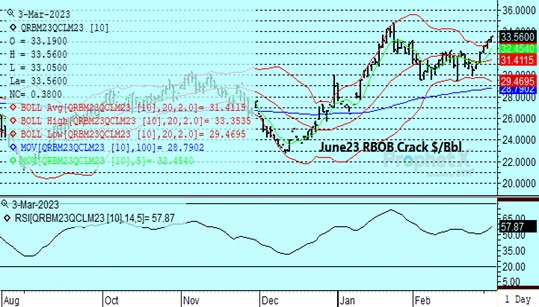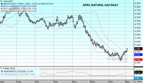 The 3-dollar level was violated today, as the April reached an intraday high at 3.027 before settling 24.4 cents higher at 3.009. Sentiment is building toward the idea that the supply/demand balance is moving toward equilibrium. Freeport LNG continues to take in more gas, reaching 1.4 bcf today, which is more than 60 percent of capacity, while overall LNG flows were indicated at a record 13.8 bcf. Weather revisions were supportive, with colder temperatures projected in the 15-day outlooks, albeit back-end loaded. In the background and mostly unmentioned were increased pipeline flows to Mexico, which have recently inched up to 5.8 bcf/d. The move above 3 dollars now targets 3.36 which would achieve a 38 percent retracement of the winter break. In order to extend to those levels, the cold temperatures currently forecast will need to be maintained in the coming days. Initial support should surface near 2.70 and beyond there in the 2.53-2.50 area.