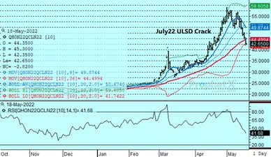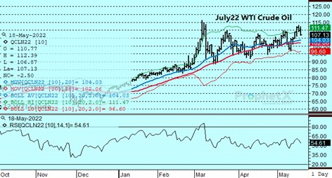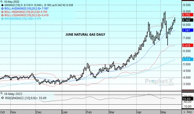 June crude oil reached our long-standing intermediate term objective of 115.00 and continues to find resistance above that level as Europe faces opposition from Hungary on enacting a Russian oil embargo. Although hope that a summit on May 30-31st will change the Hungarian veto, it remains uncertain whether a phased in ban will be adopted. In the background are statements by Fed Chairman Powell suggesting that their focus on containing inflation will lead to further interest rate increases in the months ahead. Neither the DOE report nor the appearance that China is moving out of lockdowns appeared to support values.