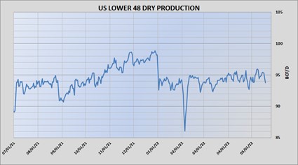 The uptrend has remained in place with a new high put in for the sixth straight session. The active June contract peaked at 8.548 before settling at 8.368 for a gain of 6.4 cents on the day. Support continues to be provided by warm temperatures and stalled production. After a weekend uptick, output has pulled back under 95 bcf/d as the 300 plus bcf deficit to the 5 year average looks likely to be maintained into mid-summer. As the chart (right) shows US production has seen no meaningful improvement this year. Add to that the rebound in LNG flows, indicated at 12.9 bcf today, and the upward bias appears justified. The wave of selling seen mid-session was likely spillover from the sharp selloff in equities as recession concerns build, but it ultimately had more effect on the petroleum sector than gas. Tomorrow’s storage report is expected to show a build near 87 which is in line with the five year average. Until production shows consistent growth the path of least resistance remains higher, with 8.75 offering minor risistance and beyond that there is little in the way of a move to the highs near 9 dollars. Pullbacks should find support at 8.00 and below there near 7.75.