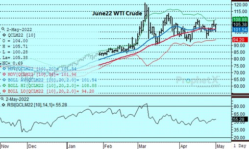 The petroleum complex saw sharp early losses, with the June crude falling to a low of 100.28 before recovering strongly and settling over 105.00. The early weakness reflected growing concern over Chinese economic prospects following the release of their Purchasing Managers Index on Saturday. The index contracted at a steeper than expected pace of 47.4 in April from 49.5 in March as widespread COVID-19 lockdowns halted industrial production and disrupted supply chains, raising fears of an economic slowdown in the second quarter which could weigh on global growth. Ideas that the pace of contraction in China will slow as the pandemic comes under control, along with additional stimulus by the Chinese central bank appeared to encourage bargain hunting at the lower levels, with short covering developing on ideas Europe is still considering further reductions in Russian oil imports if not an outright halt. The potential for this to exacerbate current supply tightness as exports of crude and products expand at the expense of the US domestic market also appeared to attract buying interest on the setback.