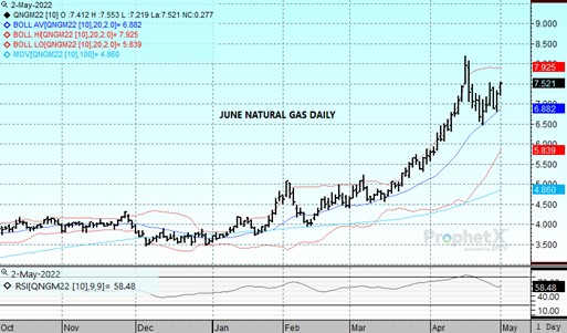 The market traded firm coming out of the weekend, with prices testing the 7.50 level intraday before ending the session with a gain of 23 cents at 7.475. Fundamentals were positive leaning across the board, although not enough to justify the size of the move. Total degree days increased from Friday’s forecasts, production downticked from weekend levels although showing improvement after last weeks losses, and LNG flows saw a small increase to 12.2 bcf/d. With long term forecasts pointing to a hot summer, the concerns about output continued to support an upside bias to trade, and with an emergency meeting of the EU today to discuss whether payments to Russia in Rubles would breach sanctions, the market had enough reasons to press the upside. 7.50 remains an important level, with a settlement through there likely leading to a test of 8 dollars and the mid-April highs.