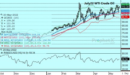 Although fears persist over global supply availability and low inventories, it appears that uncertainty over China’s economy along with demand destruction, particularly in Europe, might ease these concerns for now and limit movement above 115 in July crude, while support is still likely on sharp pullbacks to the 102-104 level.