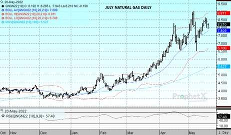 Prices retrenched over the last two sessions as the July contract tested the 8 dollar level both days but managed to reject that area, settling with a loss of 22 cents today at 8.178. Yesterday’s storage report showed a build of 89 bcf, which was slightly above estimates. The market rallied after the release but gave back most of those gains by last nights reopen. Downward revisions to temperatures in the 15 day forecasts along with an uptick in production above 95 bcf added pressure to the end of week profit taking dip. the Baker Hughes rig count showed a gain of 13 oil and 1 gas rig. This supported the existing expectations for crude production to steadily increase and the associated gas that goes along with it. Despite the fundamental negatives th market managed to push higher late in the session. LNG flows played into the support, steadily returning from maintenance to revisit the 13 bcf/d level. The path of least resistance continues to be higher, with initial resistance just above 8.60 basis July that likely doesn’t reign in a test of the highs near 9.00. Substantial support remains at the 8 dollar level on a settlement basis, but a push below there could lead to rapid declines similar to what we saw early in the month.