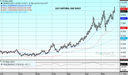 The market shot through the 9 dollar level early in the session to put in an intraday high at 9.437, but couldn’t hold the gains as the July closed up 15.7 cents at 8.993. With specs still net short, we likely saw some stop-loss buying on the surge to the highs as volume spiked as well. Fundamentals remain supportive, as production continues to be unable to perform in a steady fashion as output dropped today due in part to planned maintenance. Exports remain near capacity and will keep a bid under this market until a consistent increase in production materializes. Their continues to be talk of double digit pricing this summer and the market gives every appearance of being talked into that conclusion. The failure near 9.50 creates decent resistance, but a settle through there is likely followed by a quick test of 10 dollars. The poor close and failure to settle through 9.00 portends a near term retrenchment that could quickly test the 8.20-8.25 area.