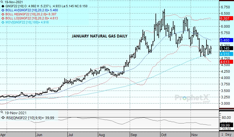 The last two sessions saw limit price action until a late rally today pushed the active January contract to settle 15 cents higher at 5.145.  The action seemed to pick up above the 5.09 area as short covering ahead of the weekend likely was to blame.  Yesterday’s storage report indicated a 26 bcf build, slightly above estimates and in contrast to what would typically be the beginning of withdrawal season.  The build put total stocks at 3,644 bcf, just over 2 percent below the 5-year average.  Less than a month ago expectations for EOS stocks were in the 3,500 area, but a mild November has put the market in a much more comfortable position for the moment.  A lack of variation to weather runs over the past two days also helped to calm prices, while LNG loadings hit 12 bcf today, which is certainly a headline grabber that likely garnered support.  Offsetting the LNG glory was production, which climbed back to the 96 bcf/d area and is forecast by the EIA to continue to improve into December.  The market has bounced of the 100 day moving average all week, and with the solid close and continued geopolitical turmoil overseas the path of least resistance appears to be upward.  Trendline resistance off the late October/early November highs comes in near 5.30, and above there in the 5.50 area.  The 100 day moving average, which is near 4.91 on the January contract, remains a key level of support, and if the market manages to settle through that area it could lead to further retrenchment.
