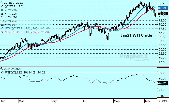 The crude oil continues to find support near the 75.00 area basis January, reaching a low of 74.76 on Sundays open.  The early pressure was linked to the rise in Covid cases in Europe and the associated lockdown potential, along with the likelihood of a coordinated release of Strategic Oil Reserves by China, the US and other OECD countries.  Japan also reported that it was considering a request by the US to release strategic reserves.  Nevertheless, fresh buying interest developed at the lower levels on ideas that the release of 100 mb, or about 1 day of demand, was unlikely to ease the pressure on prices, particularly if OPEC+ sees the move as a threat to their current control on the market.  Additional support to values was traced to reports of drone attacks by Houthi rebels this weekend on Aramco refineries in Jeddah, and to Saudi media reports of an imminent threat to shipping in the Red Sea.