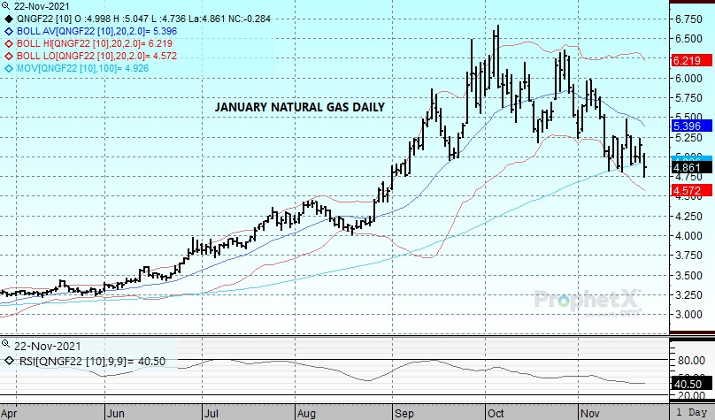 The trading week kicked off with sharp losses as the January contract settled 28 cents lower at 4.861.  Selling started overnight with weakness spilling over from overseas markets and picked up steam in the morning as weather models confirmed a significant moderation in temperatures expected into early December.  The recent strong performance from wind generation has added to demand destruction, with production also a negative influence as it has held above 96 bcf for the last 4 days.  Underlying support continues to be offered by LNG flows, which have settled in near 12 bcf/d.  Despite bouncing well off the lows, the market still settled below the 100-day moving average near 4.92.  This could lead to a further probe to the downside, with 4.70 and 4.57 as support levels.  Initial resistance is likely to surface in the 5.05 area and then from the trendline off the late October/early November highs in the 5.18-5.20 range.  Early estimates for this week’s storage report, which will be released on Wednesday due to the Thanksgiving holiday, are for a 21 bcf draw, with the 5-year average at 44.