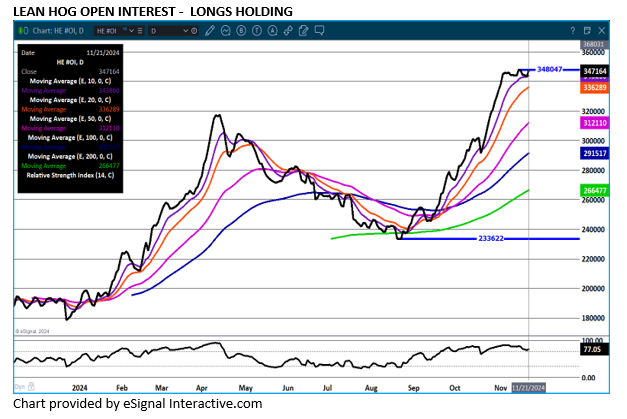 Lean hog open interest remains large. The question is how are traders going to carry positions into 2025. A clue is that hogs are bear spread. December lean hogs are $3.95 under February 2025 lean hogs and February is $4.15 under April.
