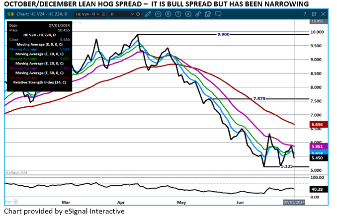 Traders tried buying Lean Hogs Monday, but with cash hogs down and the lower pork prices, Lean Hog futures sold off. Hogs are falling at a slower pace than pork. The difference between the CME Lean Hog Index and the CME Pork Index has narrowed to $6.87. The narrowing is not positive for the packer.