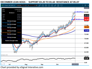 Lean hog trading was moderately active Monday as speculators are beginning to move December into 2025. Lean hogs dropped just to the 5-day moving average.