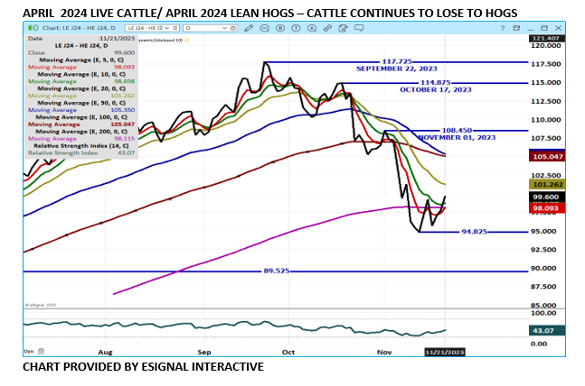 Trade volume was moderate Tuesday with Lean Hogs from February on out bear spreading. December 2023 Lean Hogs settled at $68.17 on December 21st. The CME Lean Hog Index is at $74.52 and $6.35 over December 2023 futures. Packers are in the black. Weights are increasing. Cash negotiated hogs, carcass and formula priced hogs all have been trending lower.