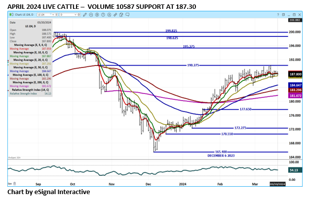 Live Cattle trade volume was light Tues and lighter on Wed. Traders are waiting for cash prices and for the Cattle and Feed report. Hedgers and speculators have concerns about the packers working fewer hours, what consumers will do as beef prices rise will there or won’t there be a seasonal demand for beef this spring and summer, will there be an increase in the number of cattle sooner than later, should they buy at current levels or sell or is the easiest trade to do nothing.