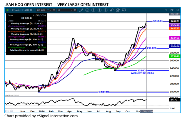 Lean hog open interest is high and trade volume has been light to moderate. Cash hogs and pork prices have been moving lower while lean hog futures have been moving up.