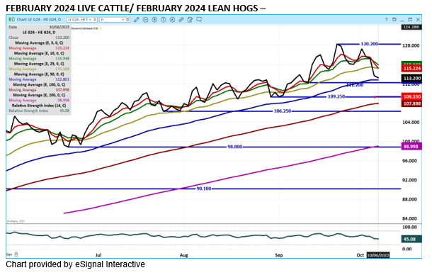 Live Cattle futures open lower Friday and reversed on the positive beef news  Futures trade volume was moderate on December Live Cattle and light for other months.  For the week October 2023 Live Cattle were down $3.27 compared to last Friday and with Monday, October 9th first notice day after the close.   December 2023 Live Cattle were down $3.47 compared to a week ago.
