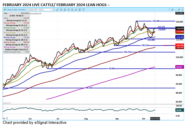 Live Cattle were higher Thursday but traders were unable to push markets to fill a small gap on December Live Cattle from 188.00 to 188.15. For the week December is up $1.10 and February is up $1.22. The December/February Live Cattle spread remains bear spread.
