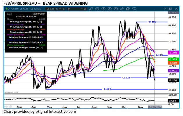 Specs are long outright futures at the same time specs are bear spread December, Feb and April.   Monday from June 2025 into the end of 2026 lean hogs made contract highs.  April made a contract high close but not a contract high.  The RSI on hogs are not overbought.